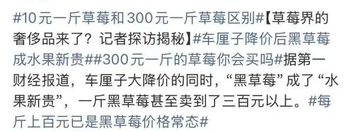 有媒体称:车厘子大降价的同时,“黑草莓”成了“水果新贵”,一斤黑草莓甚至卖到了三百元以上。