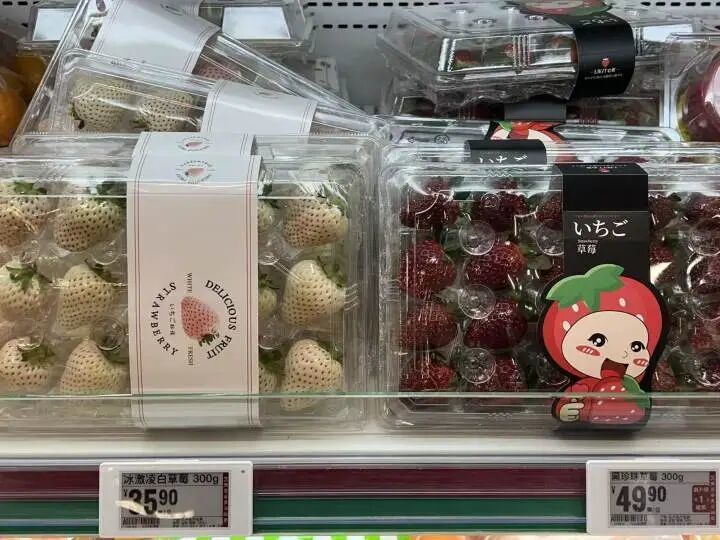 其中“白草莓”的商品名是“冰激凌白草莓”,产地是山东青岛平度,价格.9元一盒(300克)。